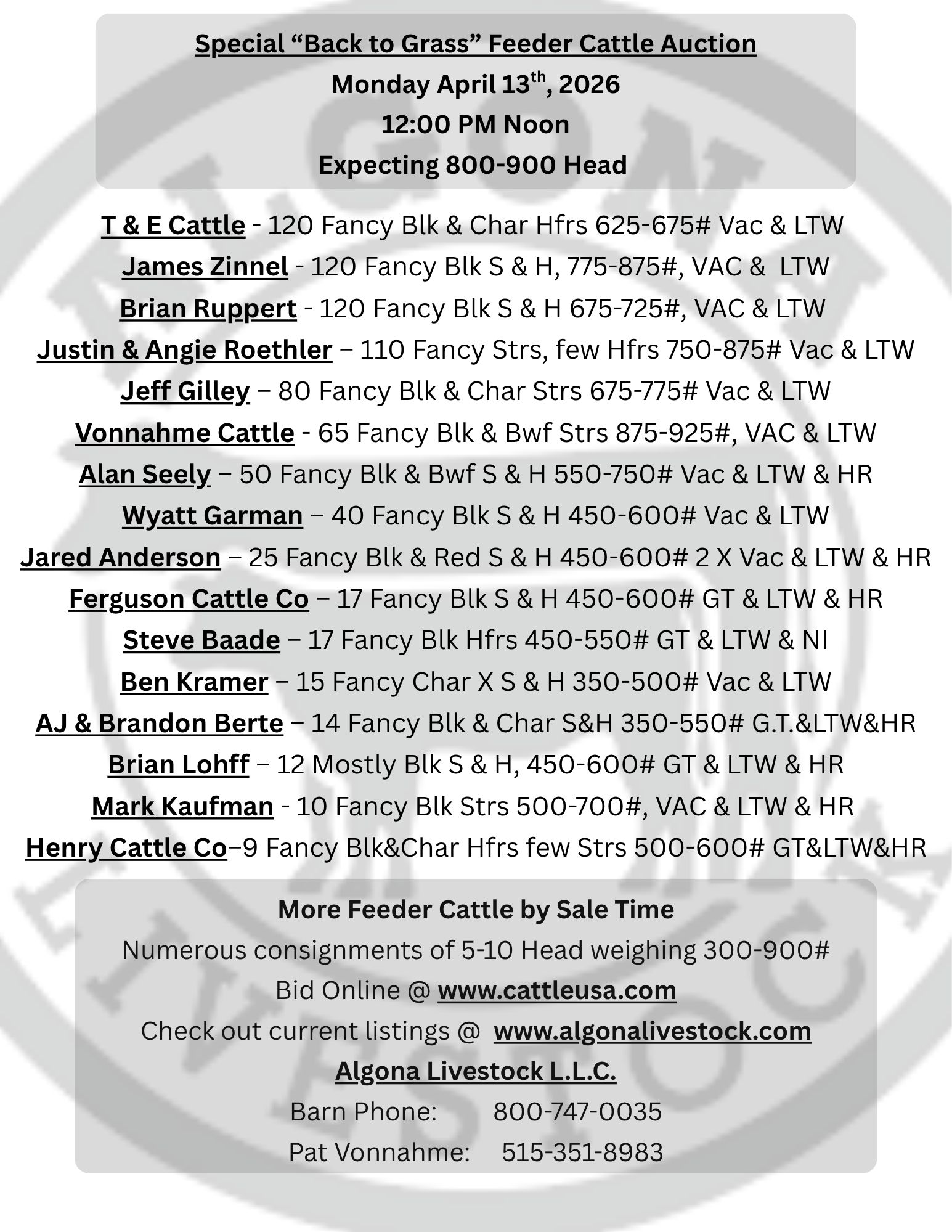 Algona Livestock Auction is a family run livestock auction that is located in North Central Iowa. Algona Livestock provides a competitive market on all classes of livestock. Every Monday, producers receive top dollar for all their slaughter livestock. Buyers on seats every week for fat cattle, cull cows & bulls,and for all your hog needs.